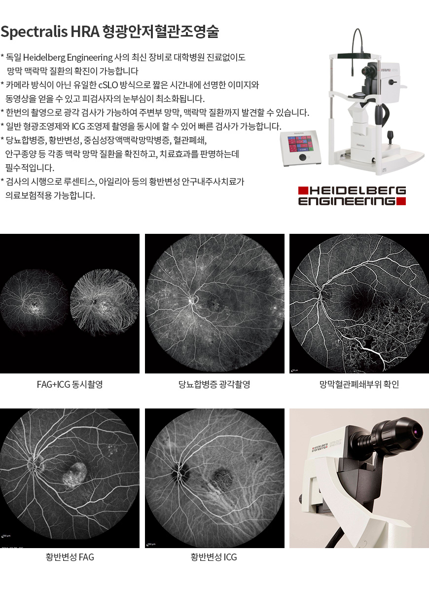망막, 황반 검사를 위해 필수적이었던 산동검사는 4시간 정도 환자분들에게 눈부심과 시력저하를 유발하는 불편한 검사입니다. 365밝은안과에서는 서울남서부 최초로 CLARUS 광각안저카메라를 도입하여 불편한 산동검사 없이 망막의 주변부까지 관찰 가능하며 자가형광촬영 모드로 초기 황반변성까지 정밀하게 진단할 수 있습니다.