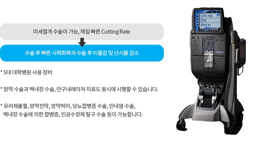 | 레이저 절삭속도 | 15Hz ~ 400Hz | 500Hz 이상 | 수술시간 단축 및 정교함으로 선명한 시력회복 가능 |