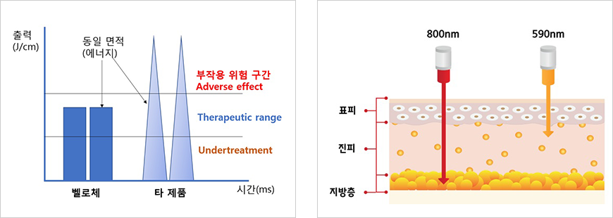 본원이 보유하고 있는 슈퍼벨로체 IPL 장비는 빛조사 방식이 gausian 방식이 아닌 스퀘어펄스 방식입니다. 스퀘어펄스방식은 치료 영역에 대한 에너지만 발생하고 그 이상의 불필요한 에너지는 발생하지 않아 통증과 기미 등의 부작용이 나타나지 않도록 합니다.