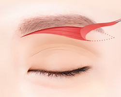 눈썹 바로 윗부분을 절개하고 남은 피부 및 근육을 제거한 후 피부를 당겨 고정 |
