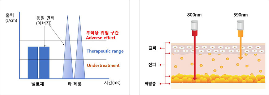 슈퍼벨로체 IPL 장비는 빛조사 방식이 gausian 방식이 아닌 스퀘어펄스 방식입니다. 스퀘어펄스방식은 치료 영역에 대한 에너지만 발생하고 그 이상의 불필요한 에너지는 발생하지 않아 통증과 기미 등의 부작용이 나타나지 않도록 합니다.