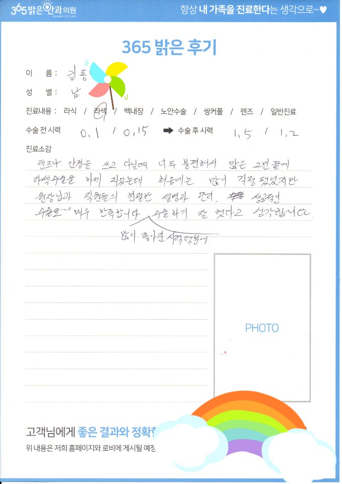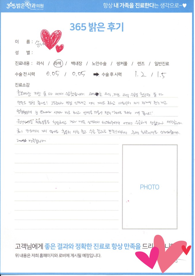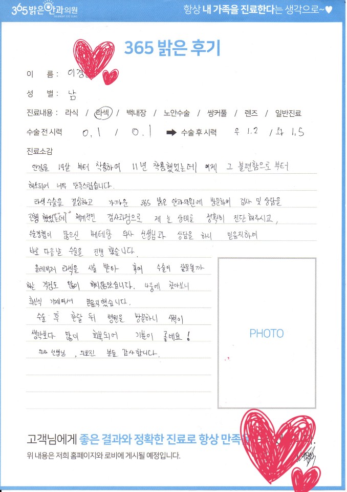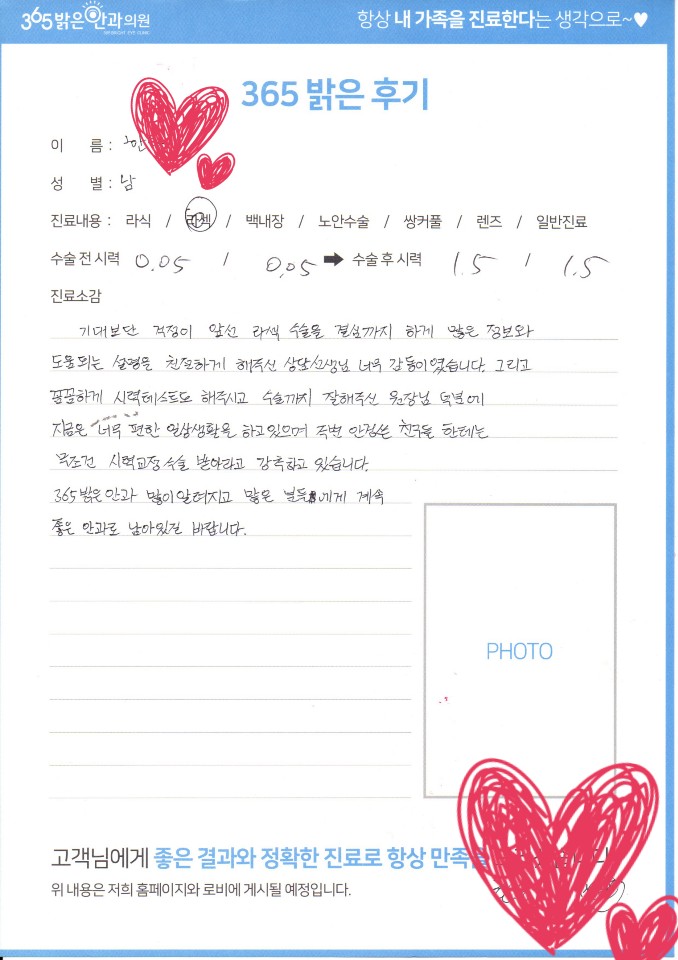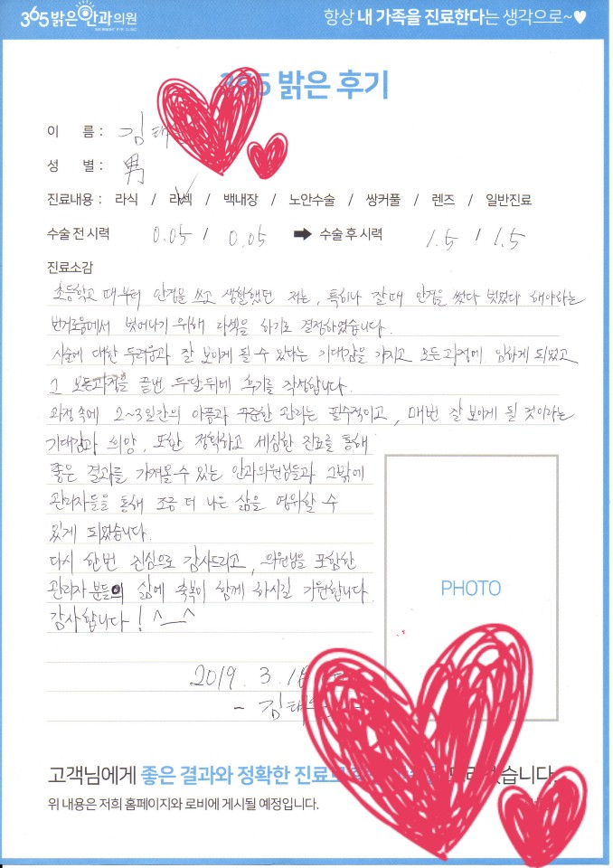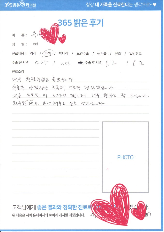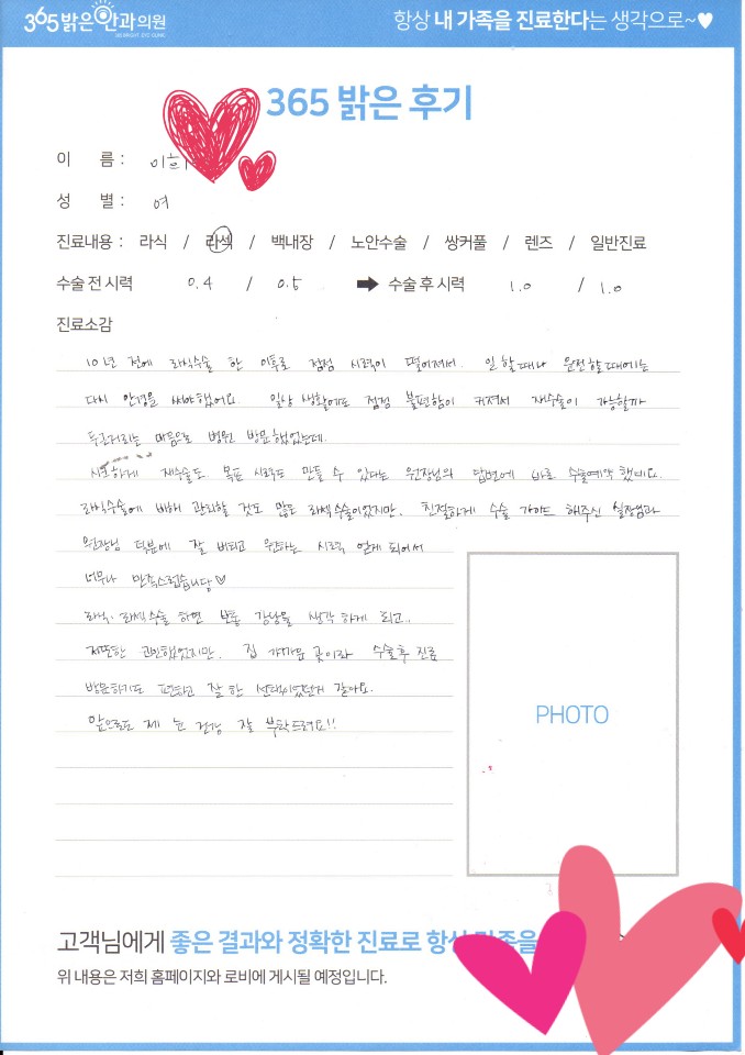 고객센터 수술체험기 온라인 상담 온라인 예약 자주하는질문 365밝은소식/이벤트 언론보도 월 수 목09:30 - 18:30 화 금09:30 - 19:30 토 요 일09:30 - 15:00 점심시간13:00 - 14:00 * 화요일 금요일은 야간진료 * 토요일은 점심시간 없이 진료 * 공휴일 휴진 02.878.3650