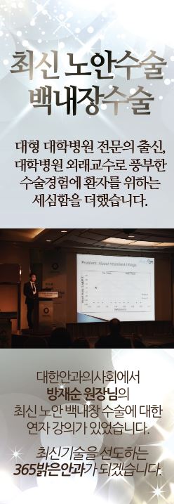 2016년 대한안과의사회에서 365밝은안과 방재순 원장님의 노안 백내장 수술에 대한 강의가 있었습니다. 유럽에서 개발된 새로운 3중초점 노안백내장 수술에 대한 한국에서의 결과를 최초로 강의하는 자리였습니다. 365밝은안과에서의 수술 결과로, 대다수 60-70대인 노령층에서도 수술 후 대부분 안경 없이 원거리는 1.0 이상, 근거리는 0.8(j2) 이상을 볼 수 있어 아주 만족스러운 수술 결과를 보여주어 안과 의사들의 관심을 받았습니다.