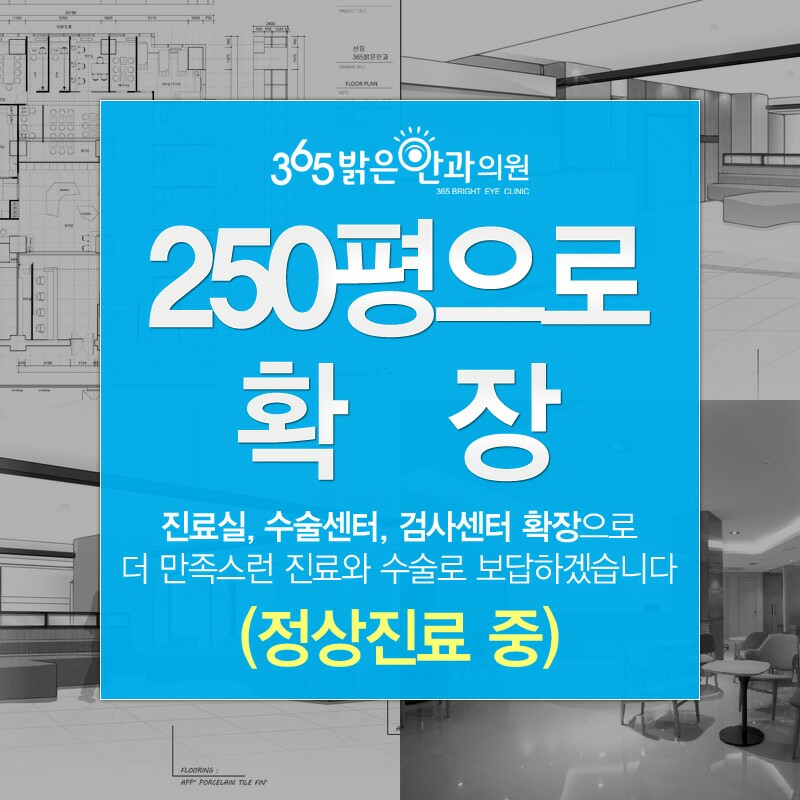 저희 365밝은안과가250평으로 확장합니다!^^ 더 좋은 서비스와 의료시스템을 제공하기위해 진료실, 수술센터, 검사센터 확장 합니다. 더 나은 수술과 진료로 보답하겠습니다. <<정상진료중>>
