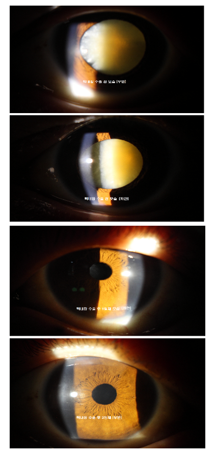 위에 사진은 47세 환자분으로 양쪽눈이 하나도 안보인지 몇개월 되셨다고 가족분이 365밝은안과로 모시고 왔습니다. 시력은 양안 모두 눈앞에 손가락이 몇개인지도 구분하지 못할 정도로 떨어져있었고, 검사 상 백내장이 돌처럼 딱딱하게 굳어지고 하얀색으로 보이는 과성숙 백내장이었습니다. 백내장이 너무 심해 눈 뒤쪽의 망막이나 시신경의 모습은 보이지 않고, 초음파를 이용하여 관찰했을 때 망막박리 등의 병변은 관찰되지 않아 백내장 수술이 진행되었습니다. 과성숙백내장수술은 렌즈를 잡고 있는 조직이 약해져 있거나 백내장 조직이 딱딱하여 수술 중 합병증 발생가능성이 높고 수술 후 각막 부종으로 인해 시력이 다시 상실되는 경우도 많은 어려운 수술입니다. 방재순 원장님의 집도하에 수술은 일반백내장과 비슷한 6분정도의 시간안에 끝났고 다음날 환자분은 안경없이 1.0의 시력을 가지게 되어 반대쪽 백내장 수술도 진행되었습니다. 우안도 수술 5일 째부터 1.0으로 현재 양안 모두 안경없이 1.0 이상 보십니다. 심한 백내장으로 관찰되지 않았던 망막도 검사 결과 당뇨망막병증이 발견되어 내과 의뢰되어 당뇨 조절 시작하셨습니다. 수술 전에 40대 환자분이 지팡이를 짚고 앞이 안보이는 상태로 보호자 부축하에 내원하였는데 현재는 혼자서 즐겁게 병원에 내원하시는 것을 보고 다시한번 보람과 뿌듯함을 느낍니다. 환자의 밝은 눈을 위해 항상 노력하고 공부하겠습니다.