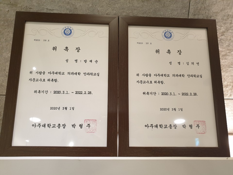 안녕하세요.365밝은안과입니다 :-) 지난 2020년 3월 ' 방재순 원장님 ' , ' 김의연 원장님 '께서아주대학교 의과대학 안과학교실 자문교수로 위촉되셨습니다. 그 동안 원장님의 끊임없는 연구와 노력에 감사드리며, 앞으로도 저희 365밝은안과는 365일 평생 좋은시력, 365일 편안한 눈, 365일 건강한 눈을위해 한분한분 최선을 다하갰습니다.