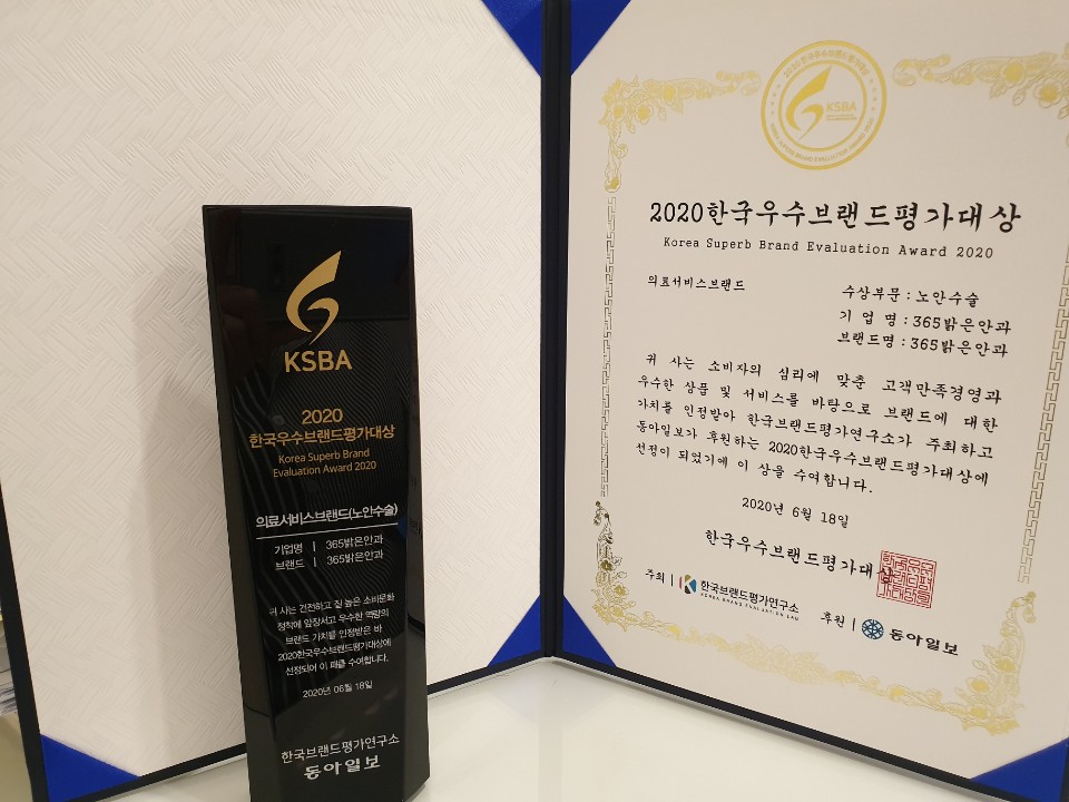 365밝은안과가 [ 2020년 한국 우수브랜드 평가대상 ]에서 '의료 서비스 브랜드 노안수술 부문 대상'에 선정되었습니다! 앞으로도 의료 서비스에 최선을 다하는 365밝은안과가 되겠습니다^^