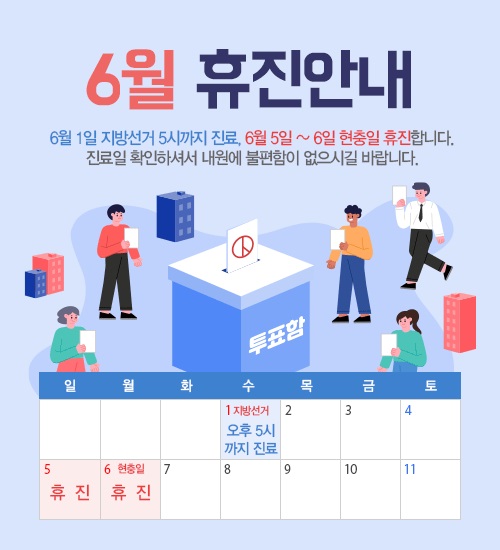 6.1(수) 지방선거일▶ 오후 5시까지 진료 6.5(일) ~ 6(월) 현충일▶ 휴진 진료 일정 확인하셔서 병원 내원 및 예약 시 불편함 없으시기 바랍니다.